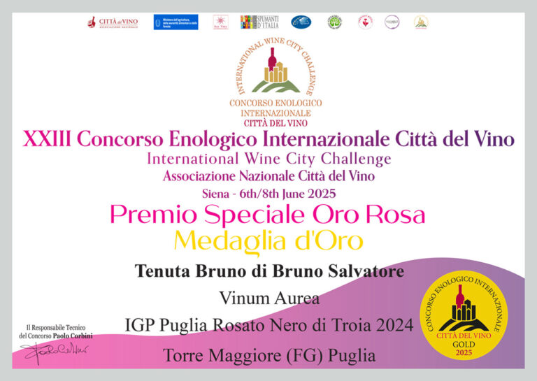Il Vinum Aurea – IGP Puglia Rosato Nero di Troia 2024 di Tenuta Bruno ha ricevuto il Premio Speciale Oro Rosa e la Medaglia d’Oro al XXIII Concorso Enologico Internazionale Città del Vino 2025.